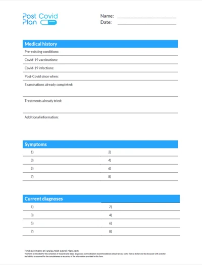 Be prepared for your consultation! A brief overview of your medical history, symptoms and diagnoses. Additional space for your concerns and questions.